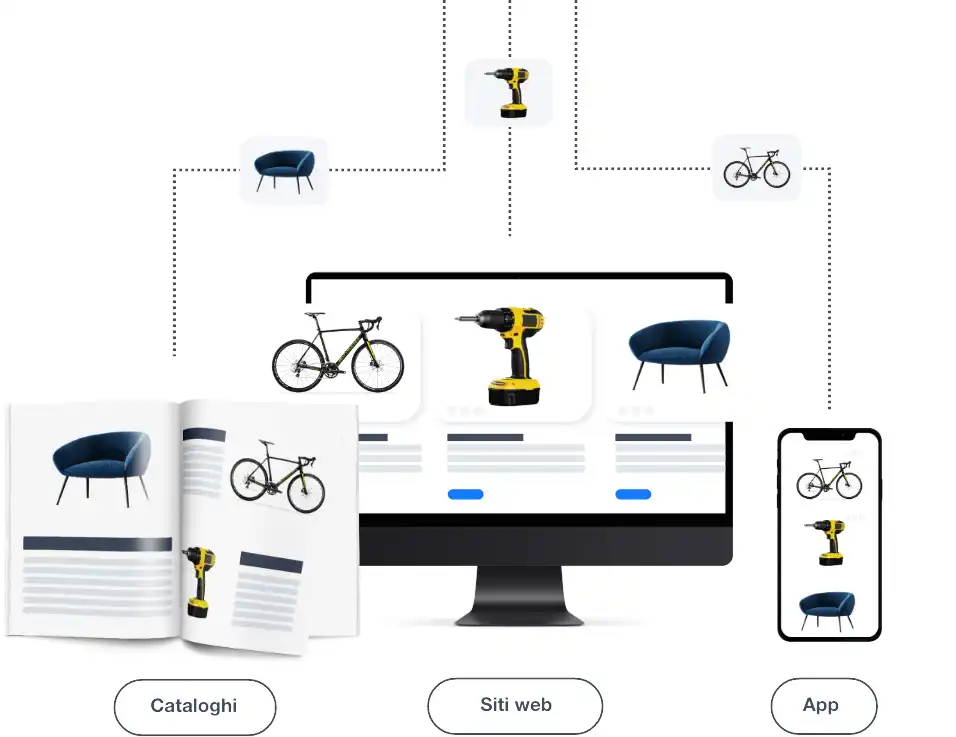 Centralizza tutte le informazioni di prodotto e le sincronizza in tempo reale su cataloghi, ecommerce, siti e app.